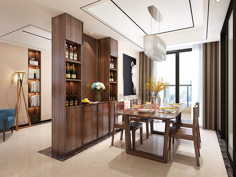 玄关通常与客厅或餐厅相连,但与厅的功能有区别,所以要通过装饰设计进行功能分区。通常采用的方法主要是吊顶、墙面装饰、地面的材料和色彩等区分或用门套、挂落、屏风、柜子等隔断。玄关可以是一个封闭、半封闭或全开放的空间,与厅的关系是连而不直达、隔而不断。