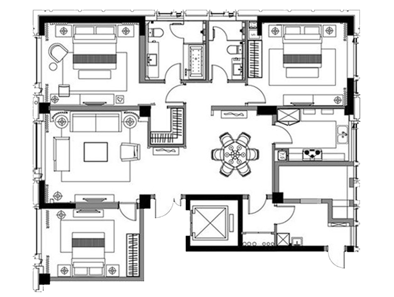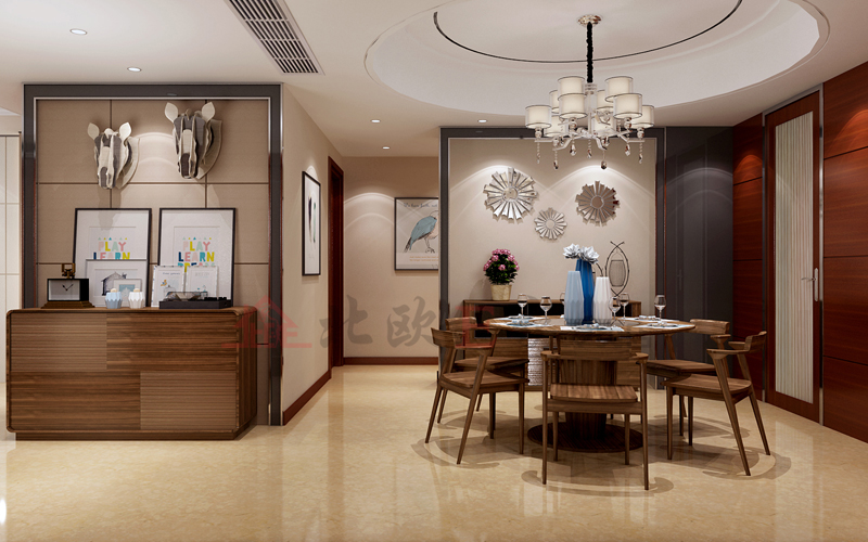 餐厅采用了圆形吊顶设计,与圆面餐桌相呼应,不仅美观,而且起到了非常重要的凝聚的效果,可以显著的提升餐厅的氛围。