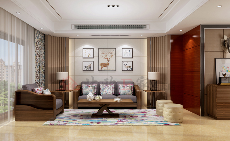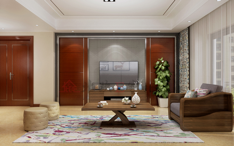 对称是形式美的传统技法,电视机背景墙和沙发的背景墙均是这种设计,给人感受秩序、庄重、整齐即和谐之美。