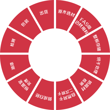 原木选材— —FAS级边材用料— —整板存储—烘干处理— —防腐材检测—自然风干二次烘干— 做成白坯—恒温室处理—油漆—检测—包装