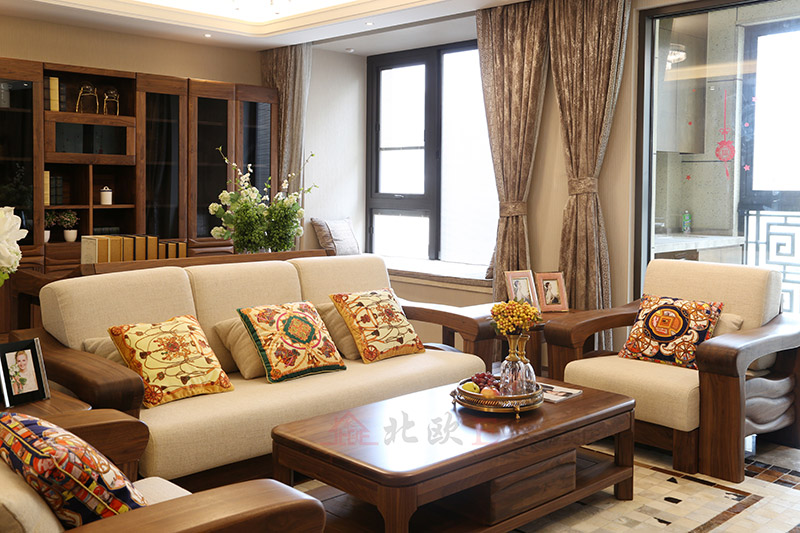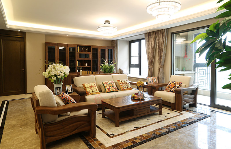 大理石作为客厅的地砖是再好不过的了,能使客厅显得更为明亮宽敞,大面积的落地窗设计,使得采光效果很好。配上厚重的实木家具,减轻了大理石给人造成过多硬朗现代的感觉。