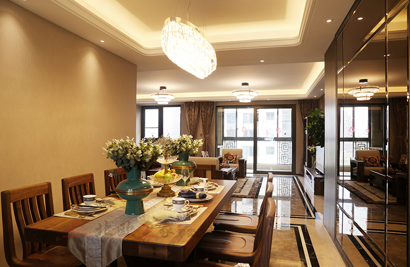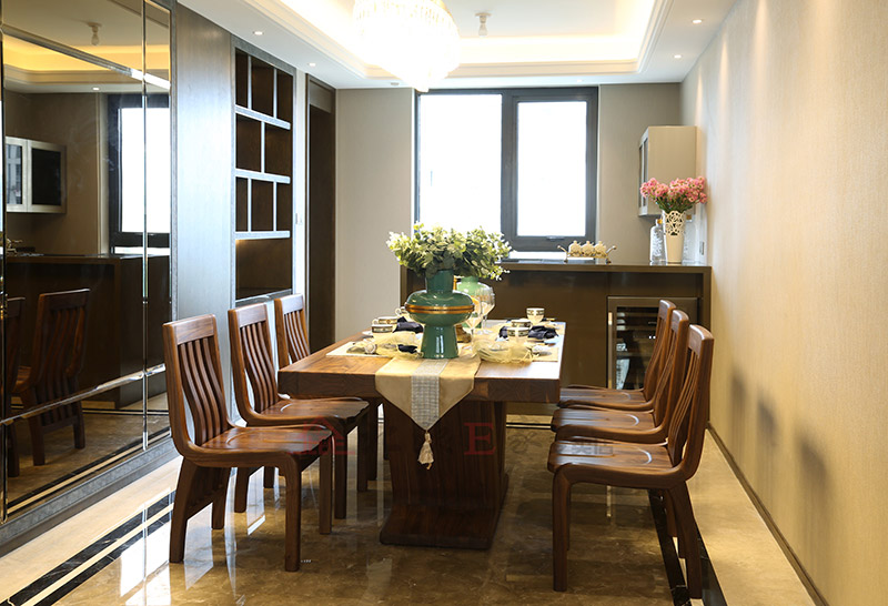 这款餐厅带给我们的是奢华与富贵同在之感,背景墙采用了镜面玻璃的设计,将空间打造出梦幻的色彩。黑胡桃材质的大餐台,搭配六把造型优美的餐椅,再用精致的餐具和花束来装饰餐桌,让人在享受美食的同时,还能带来精神上的愉快。