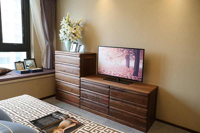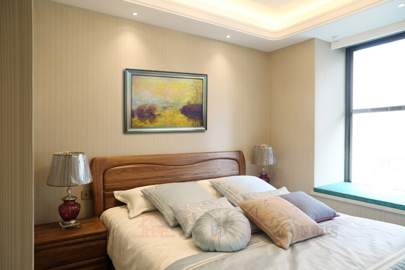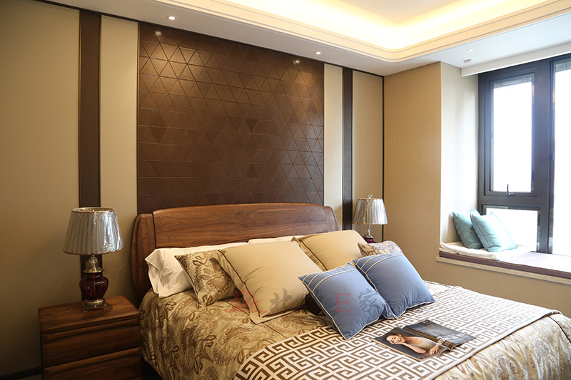 主卧床头背景墙设计的设计迎合了整个卧室气派豪华的特点,素雅的床品增添了舒适之感,床尾五斗柜和六斗柜的搭配,节省了一个电视柜,同时还有更多的收纳空间。