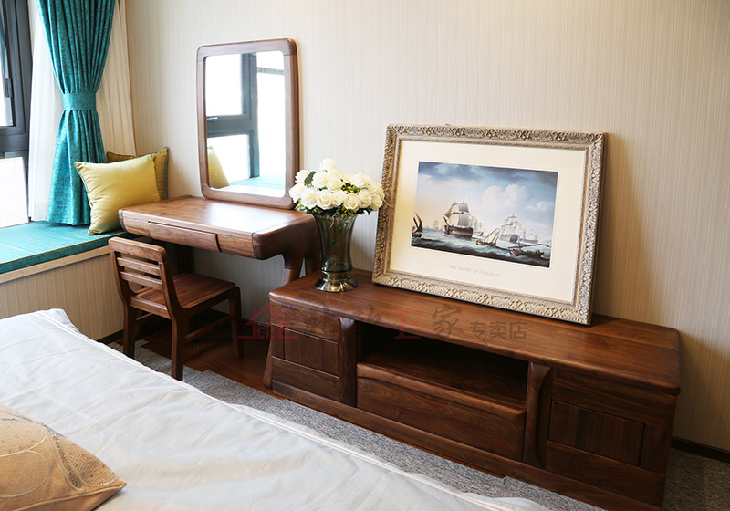 这间次卧在吊顶上并没有进行很繁复的设计风格,而是通过柔和的灯光照明让整个卧室呈现出这一种温馨的氛围。飘窗上铺一块软垫,再放上若干抱枕,就摇身一变成为主人的休闲空间,边晒太阳边品味生活,也是不错的一个选择。墙角放置一个梳妆台,透过妆镜,装扮出更美的你。