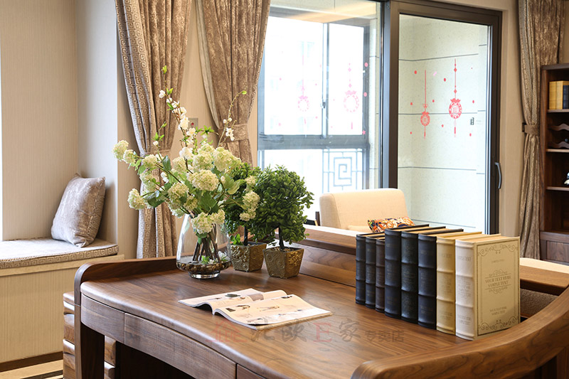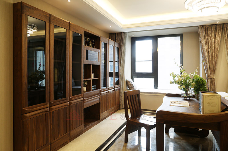 这个书房是由卧室改造的,敲掉了客厅与次卧共用的一堵墙,使客厅和书房的空间更为宽阔。书桌后方的墙壁配置了足够大的书橱,玻璃门方便取阅书籍,也增添了空间的通透感。书桌上摆几盆小植物,让人呼吸到植物释放的清香,清醒头脑,提高工作或学习效率,此外,摆放植物对书房环境也是一个很好的装饰。
