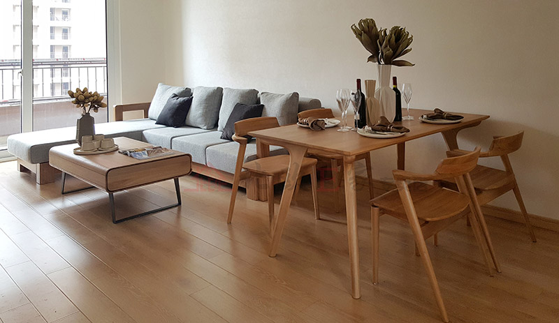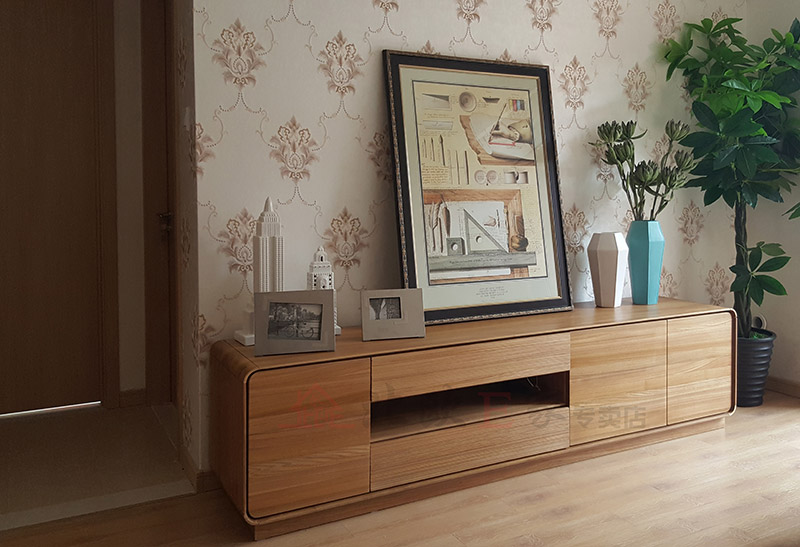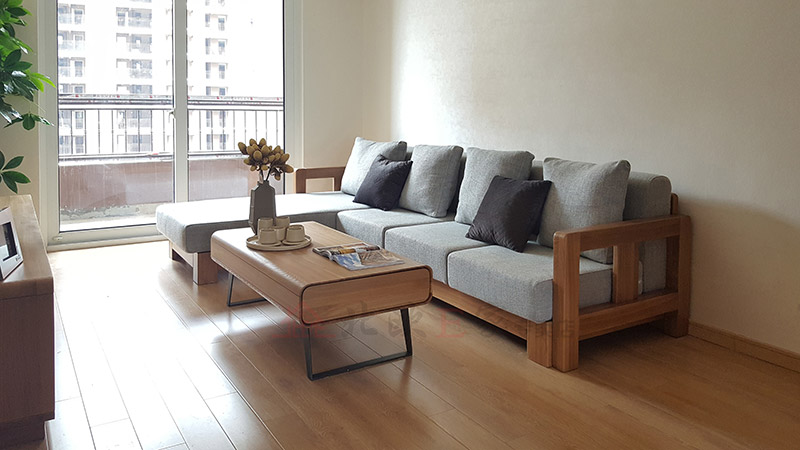 客厅选了一款转角沙发,放在墙角转弯那个地方,让内部空间显得美观的组合沙发。浅灰坐垫和抱枕与原木色的沙发绝对是最佳搭档,两者和谐的融合,散发出温暖感。此外,它们还能最大程度的包容鲜艳的色彩。
