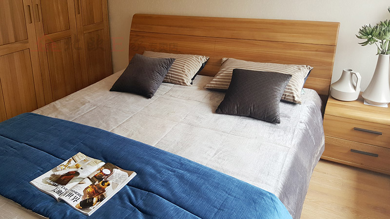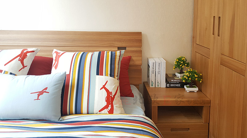 次卧是儿童房,小孩子眼里的世界多姿多彩,因此色彩鲜艳和生动活泼风格是儿童房的设计特点。绚烂色彩的床品可以有效地刺激儿童的视觉神经,使儿童对形状复杂、色彩鲜艳、有视觉深度的图形感兴趣,从而促进他们的大脑发育。同时孩子也是脆弱的,选择实木材质的儿童家具,更为健康环保。