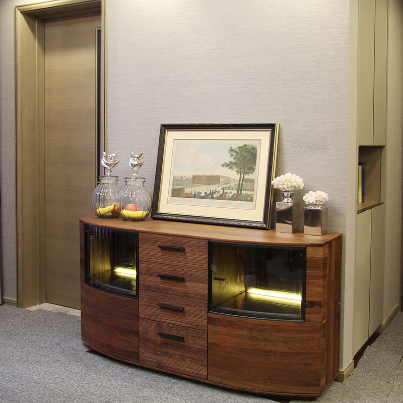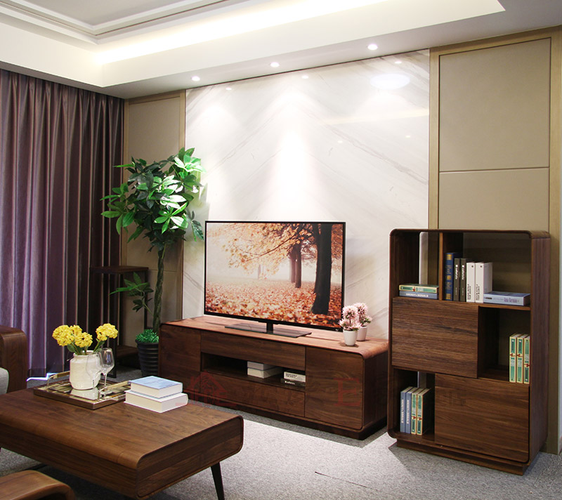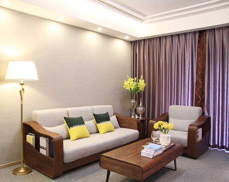 客厅选用美国黑胡桃材质的扶手沙发,侧面还有收纳功能,可以放进一些书籍,储物装饰两不误。