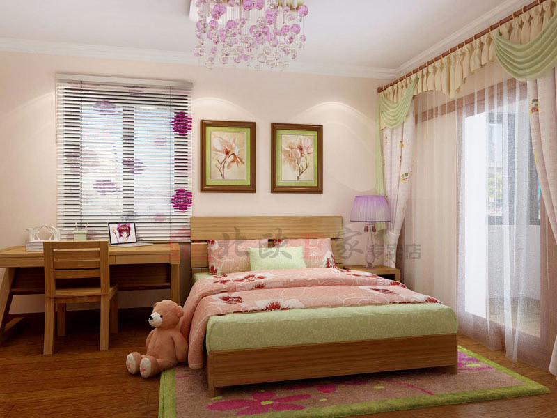 这是女儿的卧室,粉嫩粉嫩的。写字台简约大方,听说是榆木材质的,稳定性比较好,还有漂亮的鸡翅颗粒纹。
