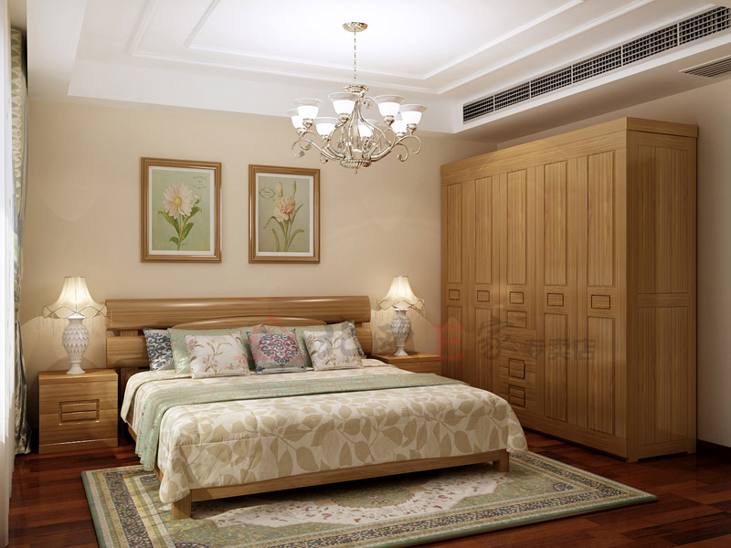 简约大方的双人床是老榆木材质的,不易开裂、变形;五门衣柜的存储量也大,把手是回字形的设计,既美观又实用。
