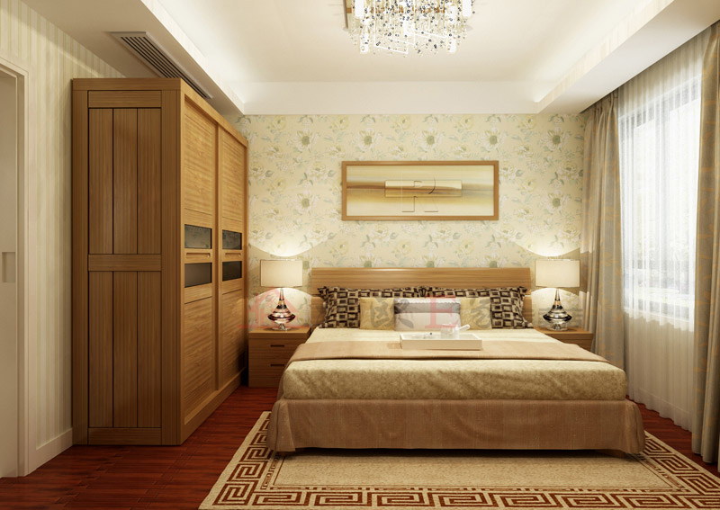 我们的卧室,绿森林榆木系列的双人床,简约大方;衣柜是移门的,打开时不仅方便,还能节省不少空间。